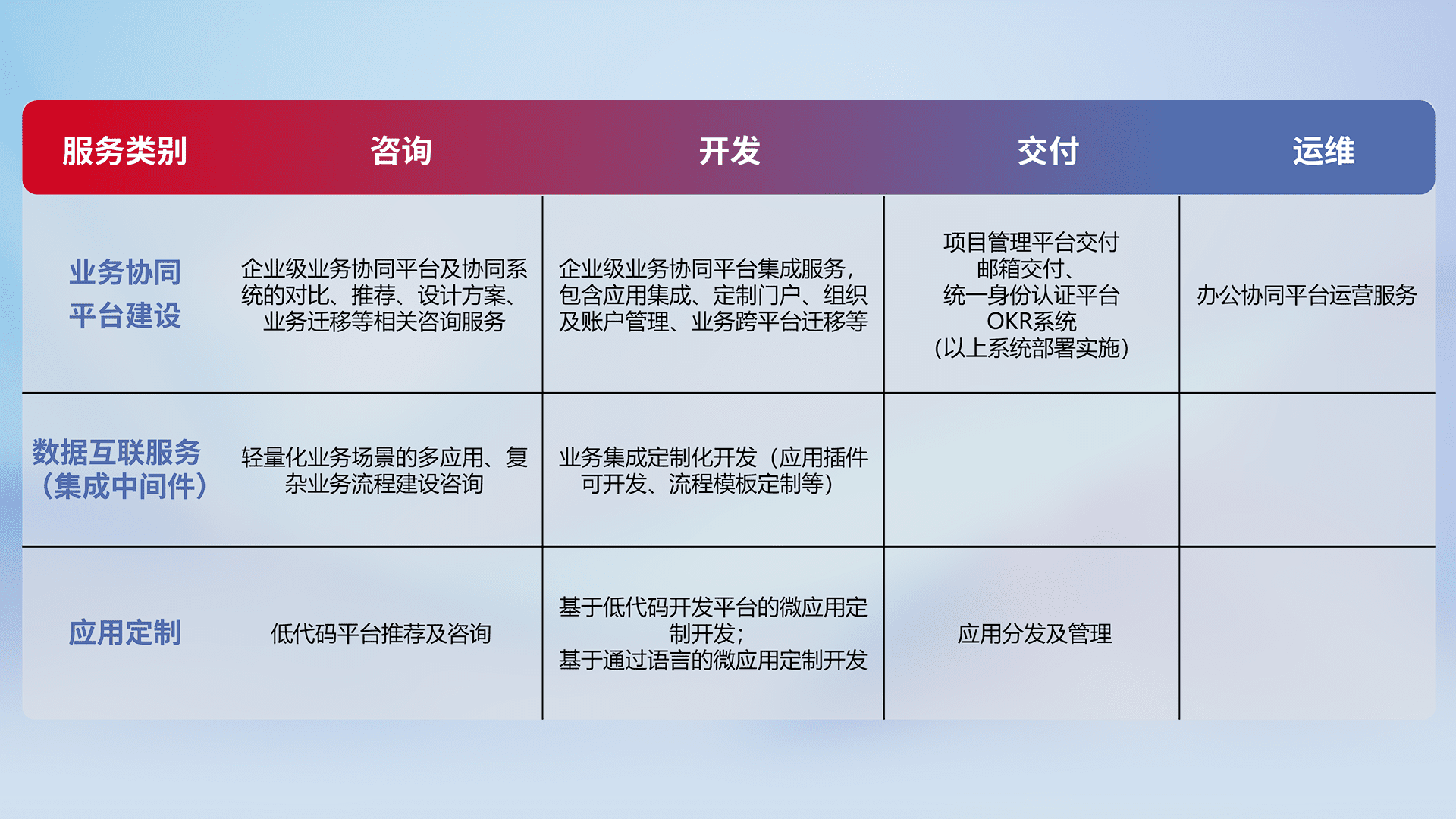 针对钉钉、、企微、、、、IDaas等平台级产品提供产品的规划、、、方案、、、、交付、、、、定制化开发等服务,,实现如统一协同办公、、、、智能客户服务、、、混合会议管理、、智能数据查询、、、、等业务场景,,,,实现数字化转型。。