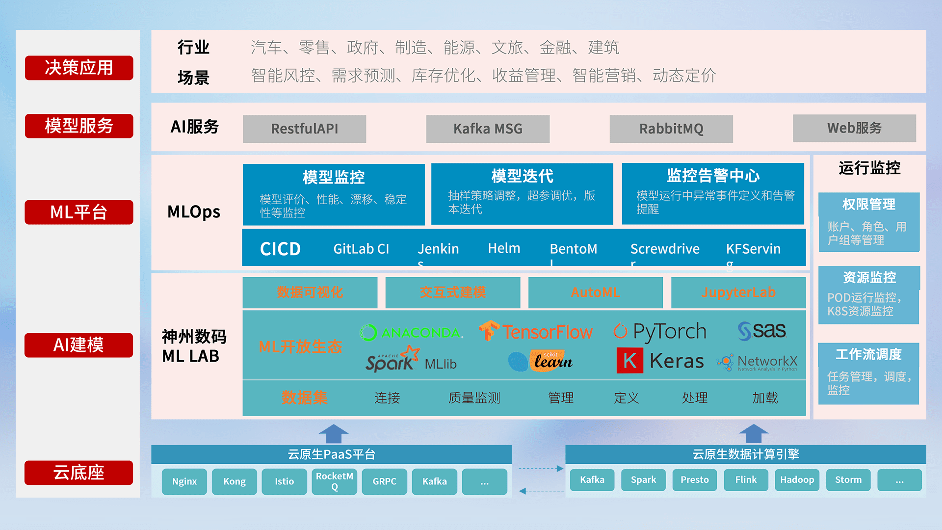 数据+模型双引擎驱动,,面向智能服务场景,,,,快速灵活利用AI技术,,,,支持业务决策,,,助力企业智能化转型破局。。